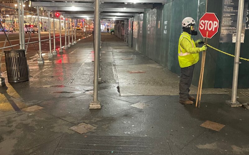 Sidewalk protection systems and scaffolding help keep pedestrians safe.